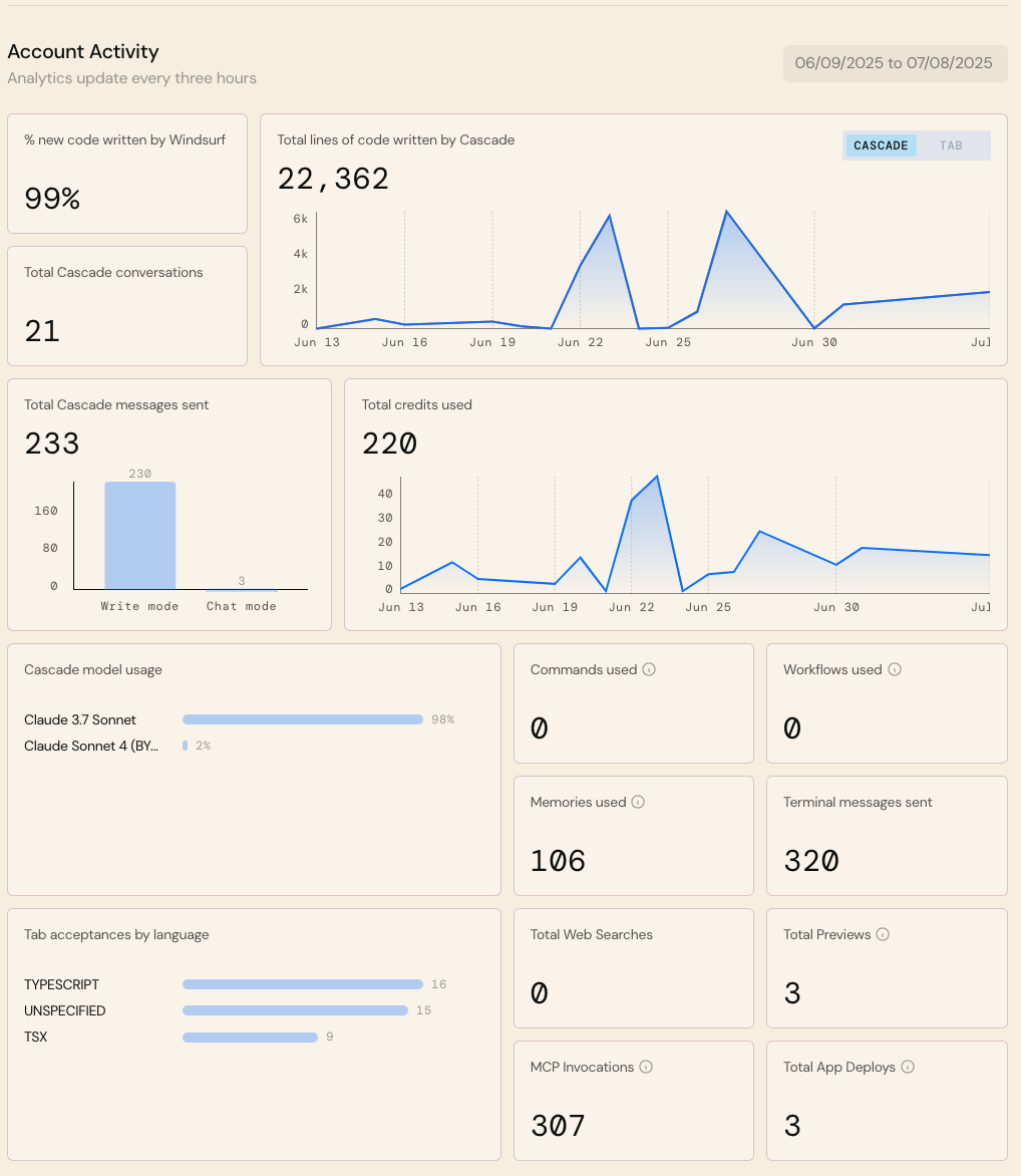 Windsurf provides me with a breakdown of my coding exploits using their IDE.