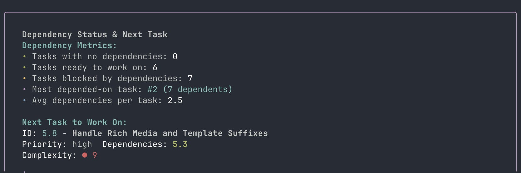 Among the ready tasks, TaskMaster sorts by the task’s priority level (High > Medium > Low). A task marked as "high" will be ranked above tasks with medium and low priorities. As mentioned, by default, all tasks are set to medium priority. However, if the user or the LLM has flagged some tasks as high priority, those will naturally be suggested first once unblocked. If multiple tasks share the same priority, TaskMaster uses secondary criteria to break ties. It considers the dependency count and the order of task IDs.